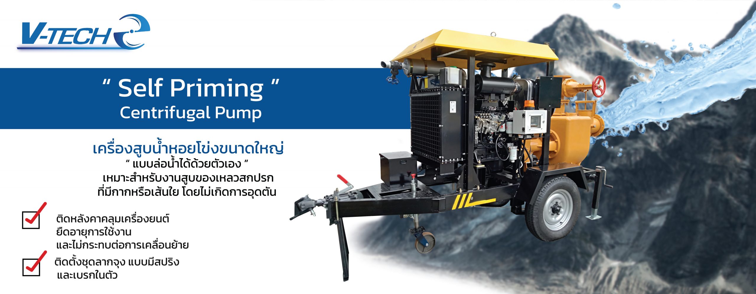 เครื่องสูบน้ำหอยโข่ง แบบ Self priming pumpsบทความ, บทความ&ข่าวสาร / By ผู้ดูแลระบบ เครื่องสูบน้ำหอยโข่งแบบ Self priming pumps เครื่องสูบน้ำหอยโข่งแบบ Self priming pumps เครื่องสูบน้ำ แบบล่อน้ำด้วยตัวเอง ใบพัดชนิด semi open (Non-Clog) เหมาะสำหรับงานสูบของเหลวสกปรก ที่มีกาก หรือเส้นใย โดยไม่เกิดการอุดตัน ปั๊มน้ำที่ขยะขนาดไม่เกิน 76 มม. ผ่านได้ เหมาะสำหรับใช้ในโรงงานอุตสาหกรรม และสำหรับงานระบายน้ำท่วม ระบบบำบัดน้ำ การสูบน้ำเสีย รวมถึงงานอื่นๆเป็นต้น รุ่นนี้ไม่ต้องล่อน้ำ ปั๊มมีลักษณะคล้ายโอ่ง ช่างหลายคนเรียกว่า ปั๊มโอ่ง เครื่องสูบน้ำแบบล่อน้ำด้วยตัวเอง หรือ Self Priming ขับด้วยเครื่องยนต์ดีเซล มีให้เลือก 2 ขนาด รุ่น 6 นิ้ว สูบน้ำได้ 4,000-5,000 ลิตร/นาที ส่งสูง 13-15 ม. เครื่องยนต์ดีเซล ขนาด 54 แรงม้า แบบเทรลเลอร์ลากจูง พร้อมอุปกรณ์รุ่น 8 นิ้ว สูบน้ำได้ 8,000-9,000 ลิตร/นาที ส่งสูง 13-15 ม. เครื่องยนต์ดีเซล ขนาด 75 แรงม้า แบบเทรลเลอร์ลากจูง พร้อมอุปกรณ์ ตัวอย่างงาน